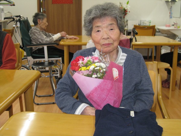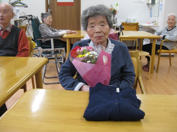 息子様から母の日プレゼントです。これから着られるようなカーディガンとお花をお持ちになられました( ^ω^)・・・ 「来てくれたんだ? 持って来てくれたの?」と嬉しそうにお話しされていました!(^^)! これは何のお花かな? カーネーションのだね! 綺麗だね(^^♪ 持って来られるなんっていい息子さんじゃない?とみんなでお喋りされていました( ^)o(^ ) 母の日プレゼントに盛り上がり楽しそうでした!!