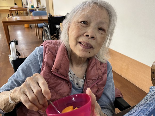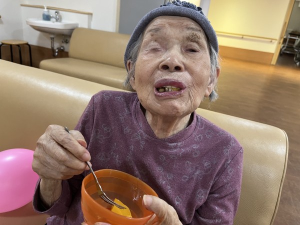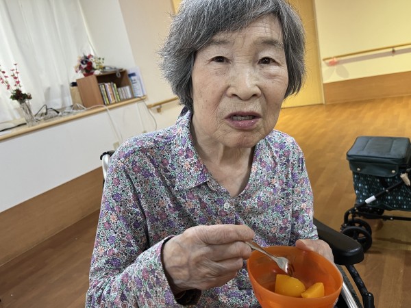桃の缶詰を食べて「美味しいね」とニッコリ顔。