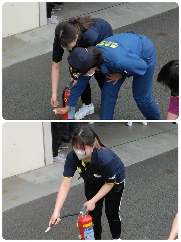 消火器を使って、消火訓練です。