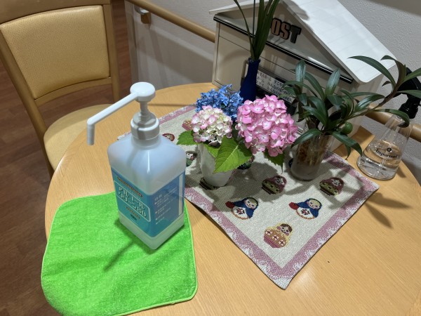 いつもある消毒の後ろに紫陽花。