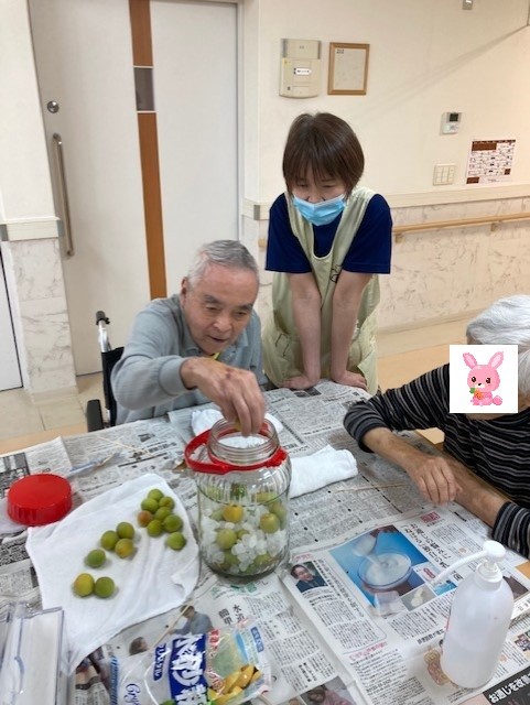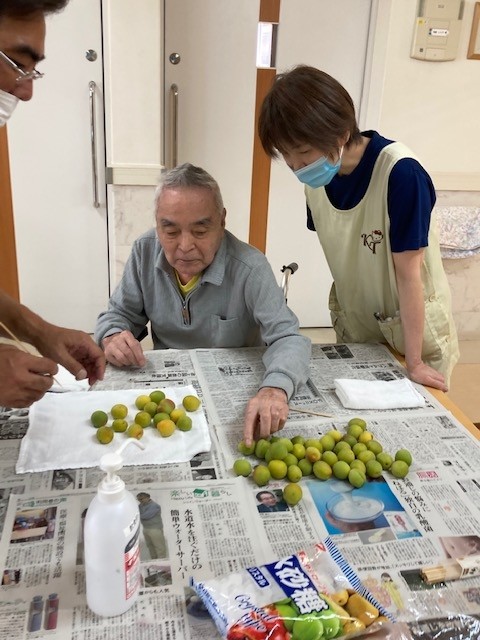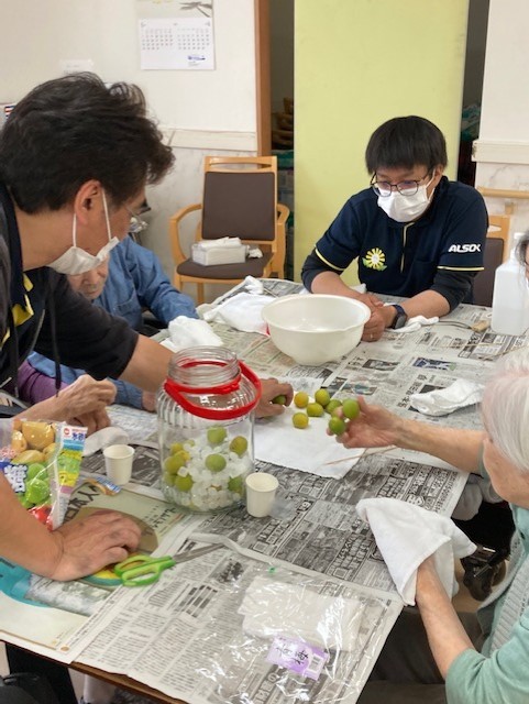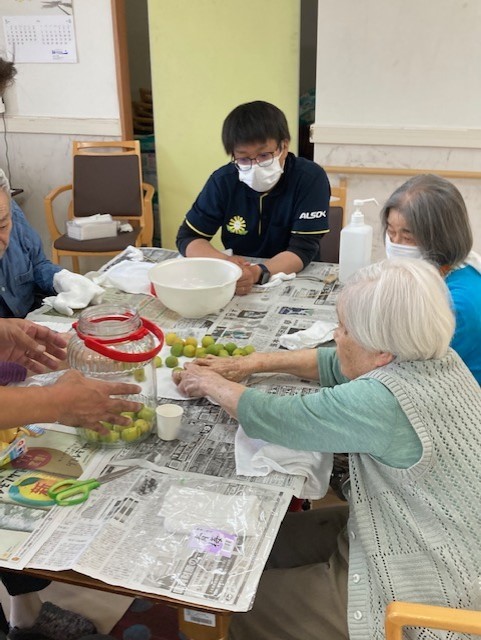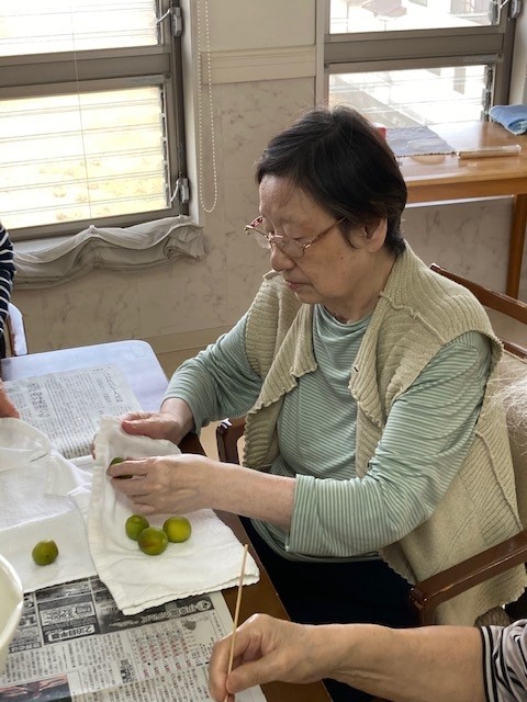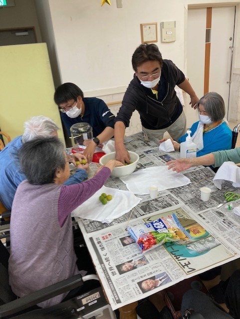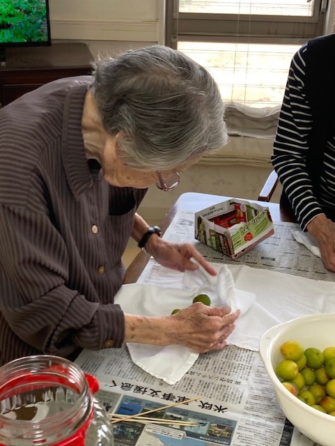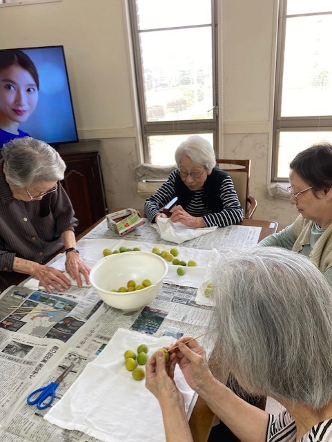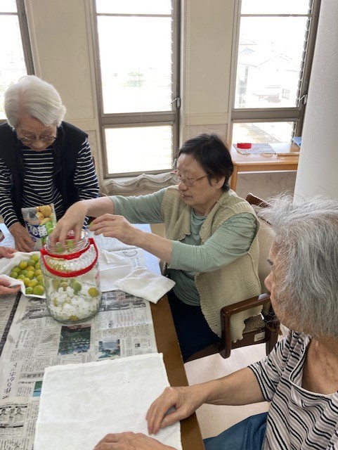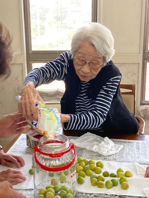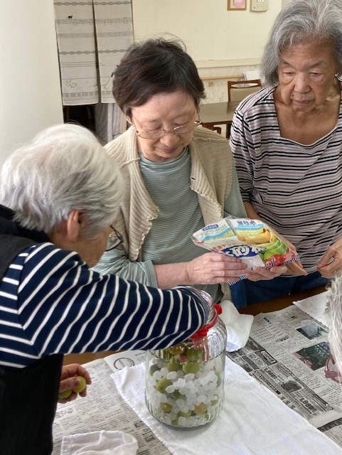 それでは3階のご婦人方、梅シロップ作りのお手伝いお願い致します~ってお声掛けさせていただきましたら…あら興味津々でたくさんのご婦人方が参加していただいております。