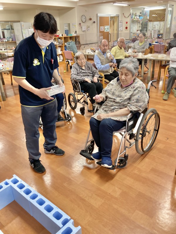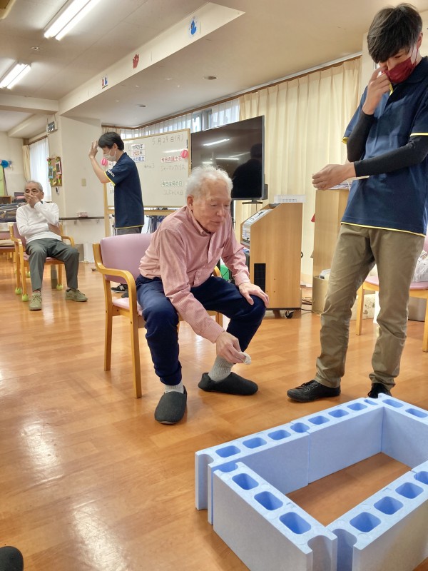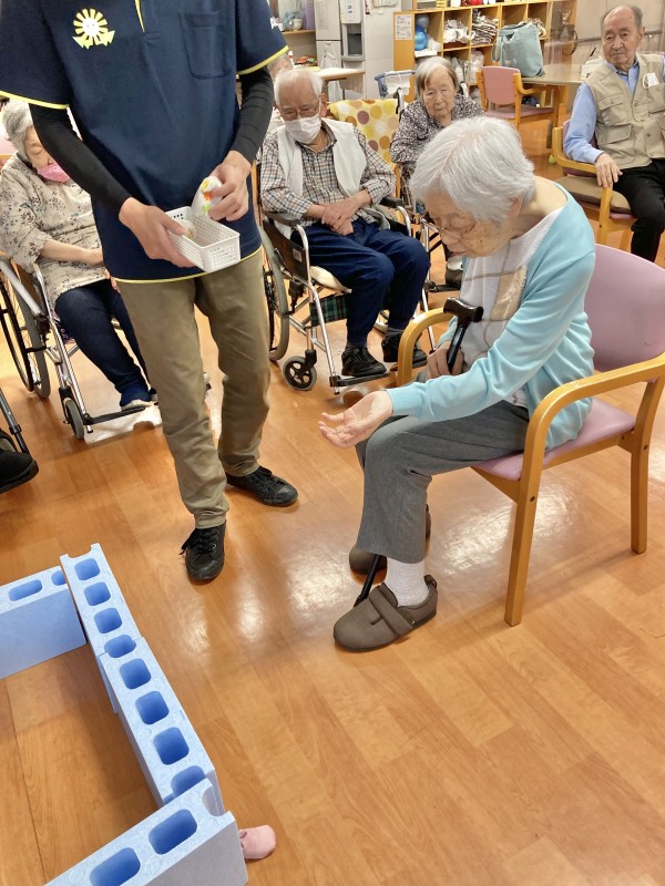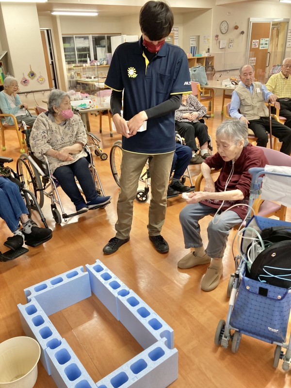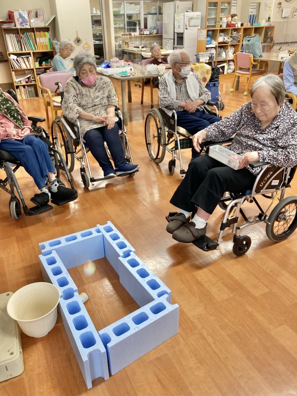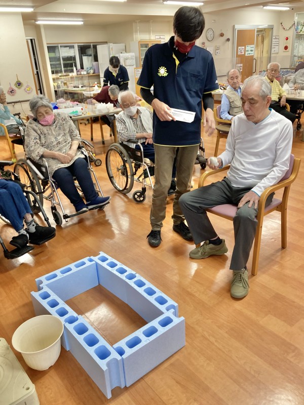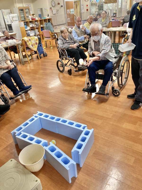 発砲スチロールのレンガの枠内、レンガの小さな穴、奥の入れ物にそれぞれ得点をつけています。