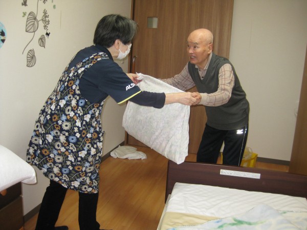 シーツ交換のお手伝いのご様子です( ^ω^)・・・ 包布カバーをお2人で畳まれています!! 相性がいいですね・・・!(^^)! 枕カバーを交換されました!! 楽しみながら交換されていました。 最後笑顔で終わりました。 お疲れ様でした。 いつもありがとうございます。と話されていました( ^)o(^ )