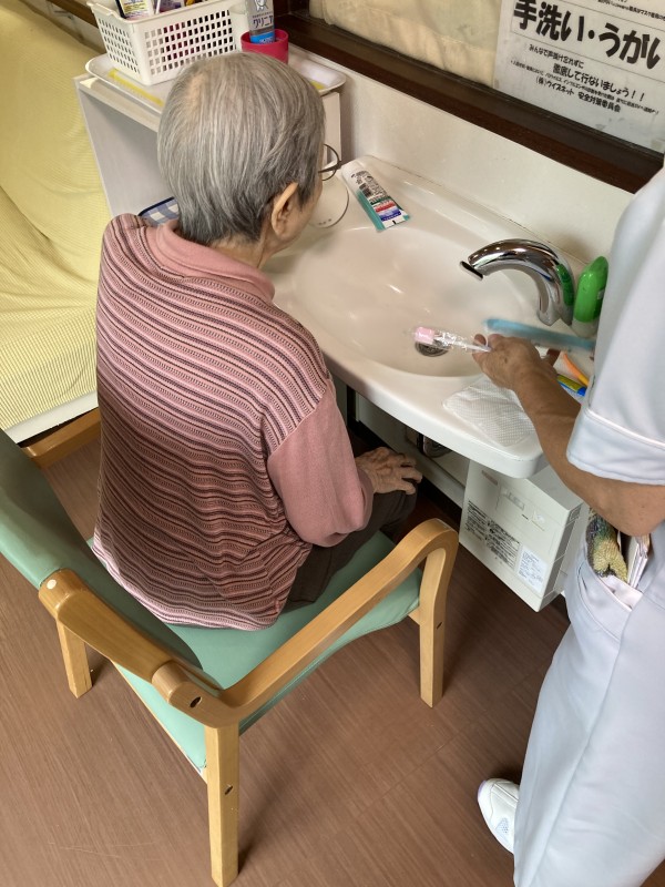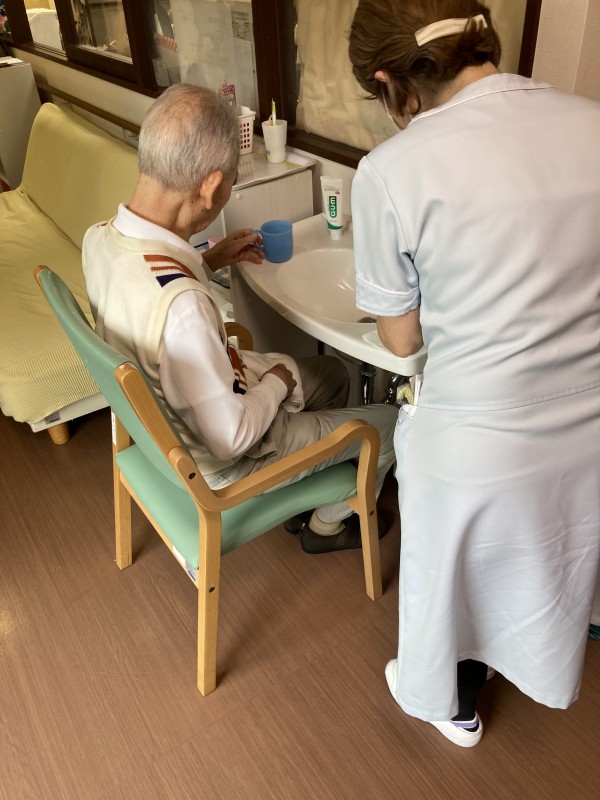 歯科衛生士さんのアドバイスに入居者様も真剣に耳を傾けながら口腔ケアを行っています。