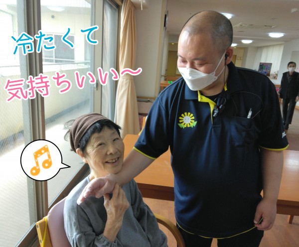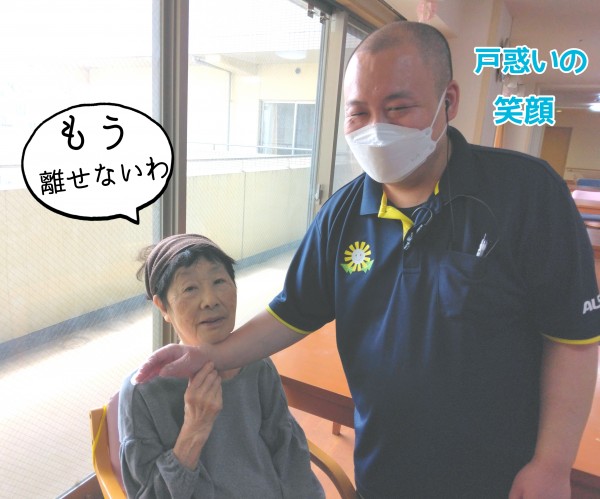 手を離して頂くタイミングを逸し、戸惑う優しい困り顔の内布ケアスタッフ(笑)。
