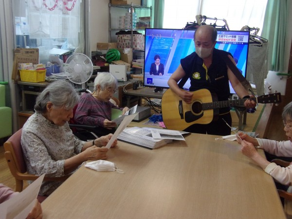 職員のギター演奏にて歌を歌われて楽しまれております。