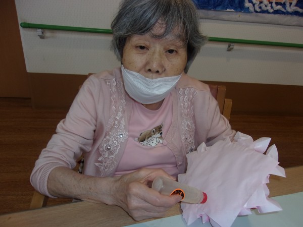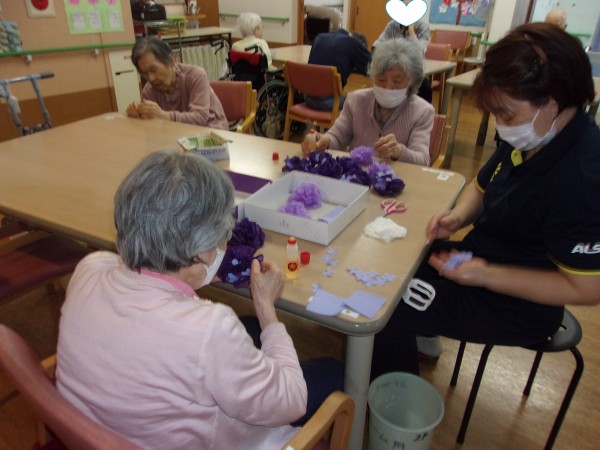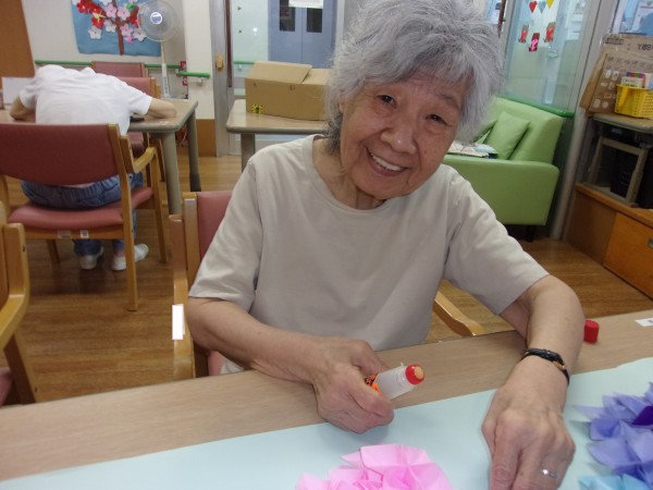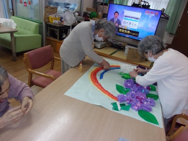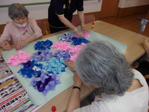 皆様の協力で、6月の壁飾りが出来上がり、貼り付けすると、「きれいね~♪本物の紫陽花みたい~!」とニコニコされながら、