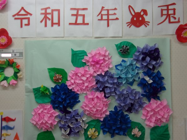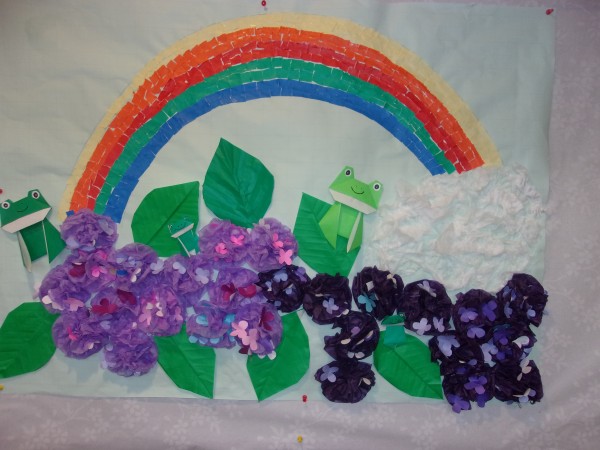 5月中旬頃から作り始め、折り紙の紫陽花とお花紙の紫陽花の2種類の壁紙を完成させました(^O^)/