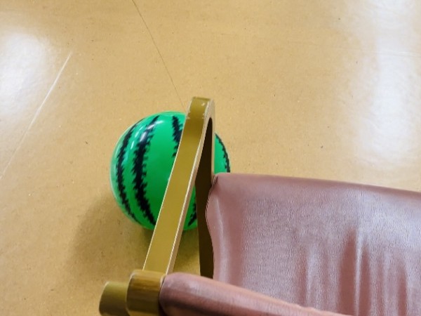 2組に分かれ、ビーチボールをオリジナルの棒で動かし、手で操ってサッカーをしていく・・・という感じになります!ちょっと見えづらいですが左右に椅子のゴールがあるのでそこまでいけばポイントになります!