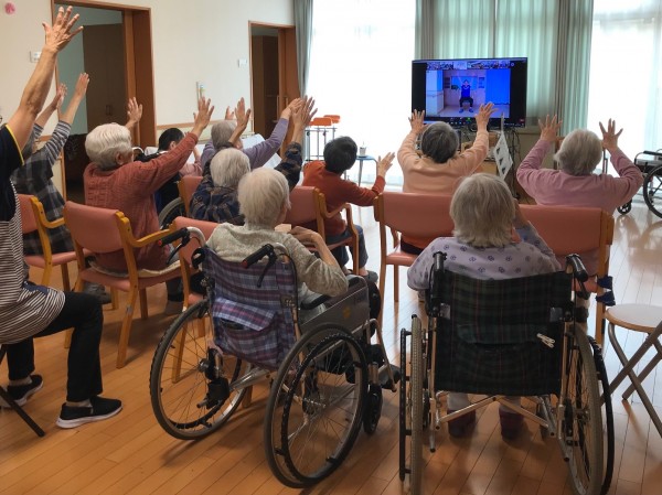 画面越しの講師の動きに合わせて、当ホームのご利用者様も身体を動かします。