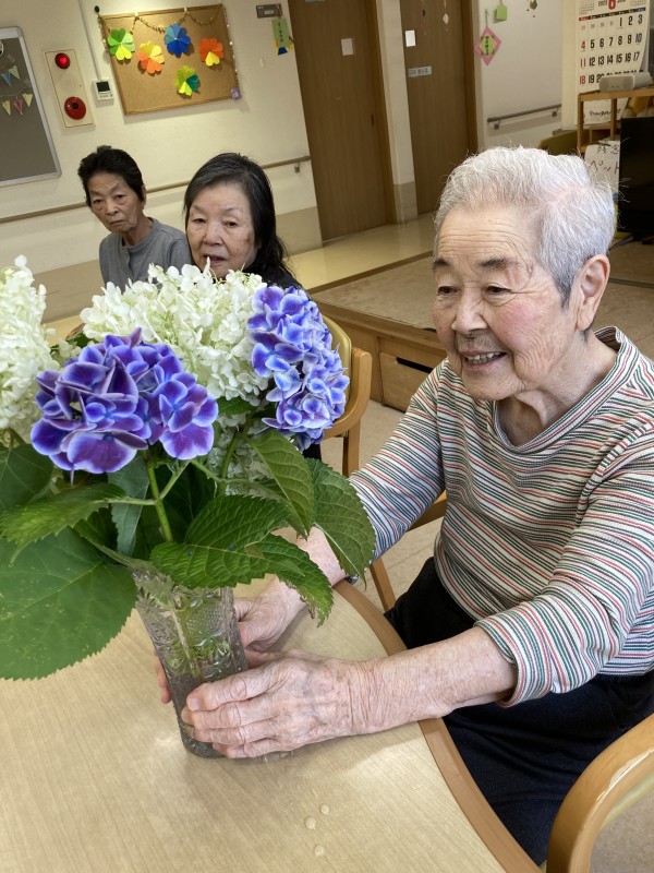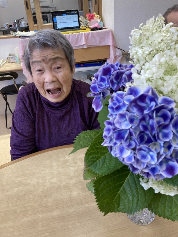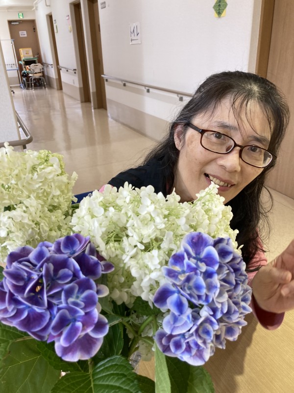 紫陽花に優しく 話しかけておられる利用者様、、、