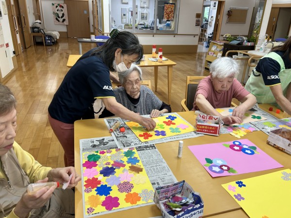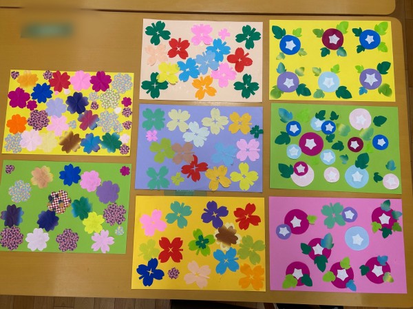 ①画用紙の色を選ぶ ②貼る柄を3種類(朝顔、四つ葉、桜)から1つ選ぶ ③貼る配置を考える ④ノリで貼る
