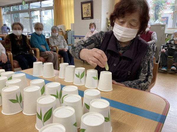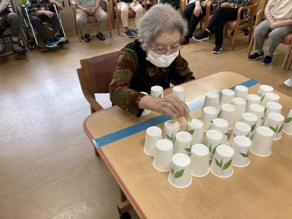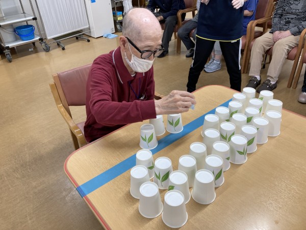 洗濯ばさみを使用して、紙コップを線の手前まで引き寄せるゲームです。