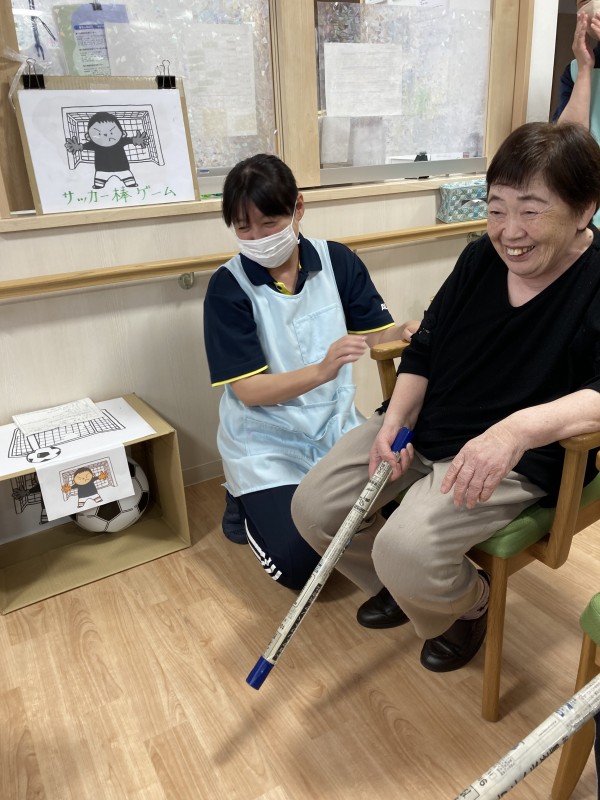 棒でサッカーボールを打ちながらゴールに入れていく、チーム対抗戦です。
