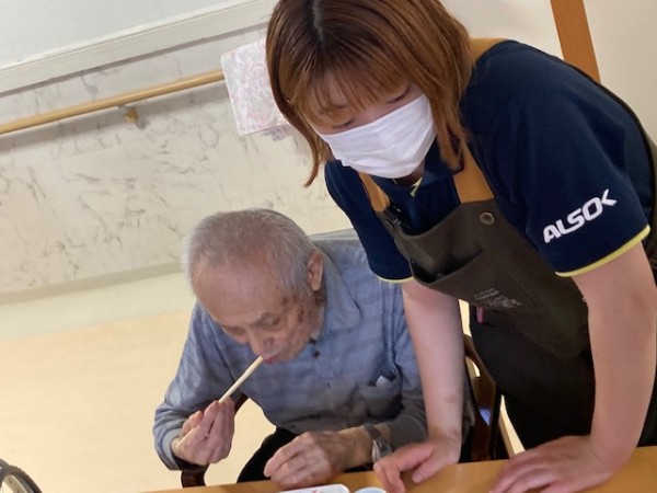 そして介助が必要な方やお代わりをお持ちするケアスタッフの皆さんの働きっぷりをご覧ください