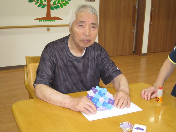 個々に紫陽花の花の貼り絵を行いました( ^ω^)・・・
