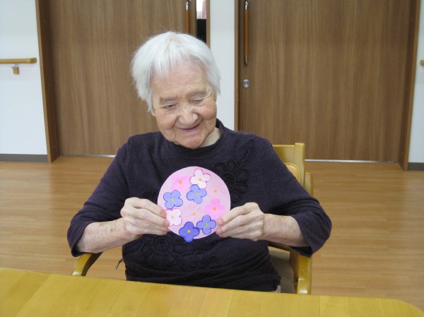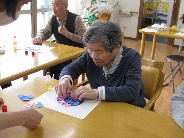 花びらを作り丸い紙に貼っていきました。思い思いにピンクや紫や青の色の花びらを貼りました。