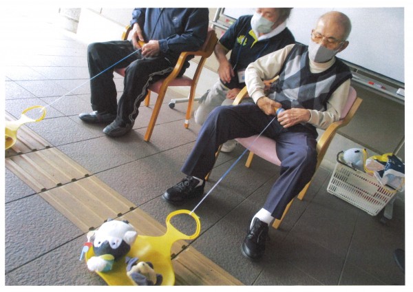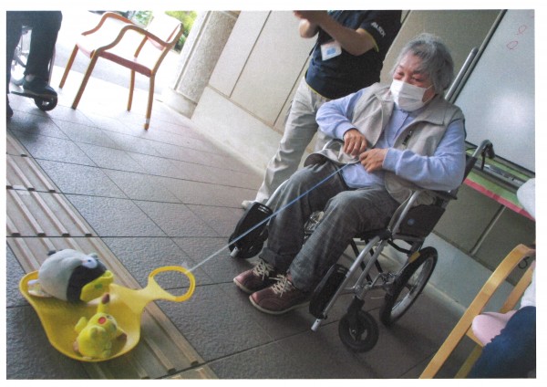 今回は、ぬいぐるみをそりに乗せて落とさないように引っ張るゲームです。ソリにひもが付いていてくるくると糸を巻いていくというもの。早く巻きすぎると振動でかわいいぬいぐるみが落ちてしまいます。慎重に糸を手繰り寄せなくてはなりません。楽しみながらも隣の方との競争になりますので大変盛り上がりました。