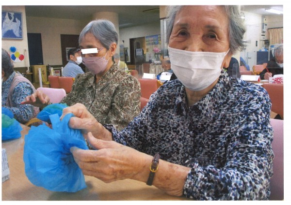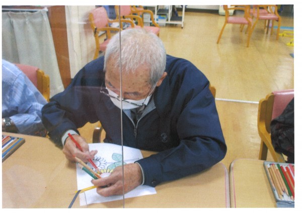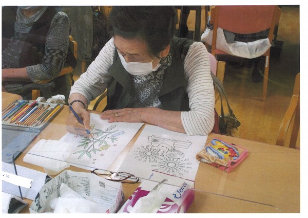 季節にちなんだイラストよりお好きなものを選んで、色を付けて頂いています。お花紙でお花を作ってくださる方も。皆様手先が器用でとても完成度が高いです。