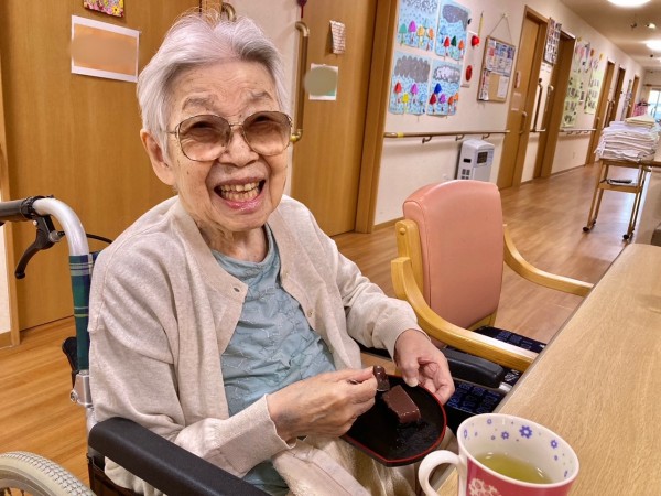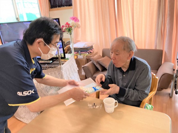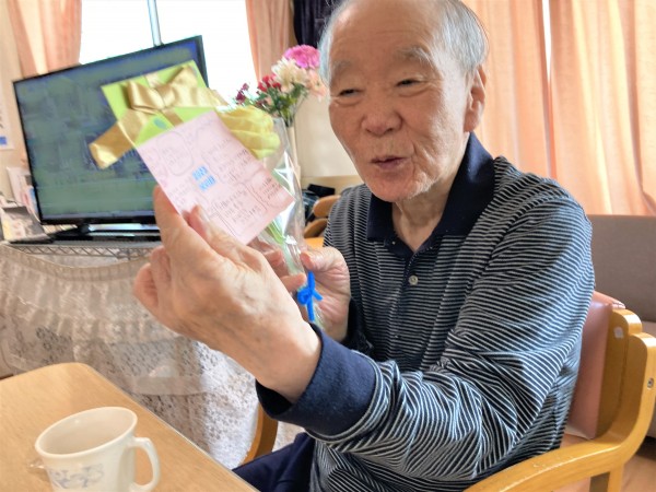 当日は、ケアスタッフの寄せ書きカードとフェルトで作ったバラの花をプレゼントさせて頂きました。