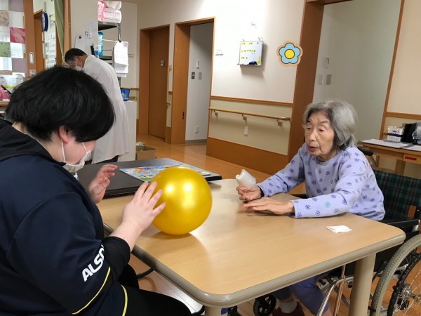 2Fのフロアに上がると、ご利用者様と職員さんがボールで遊んでいました。