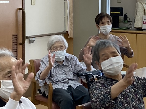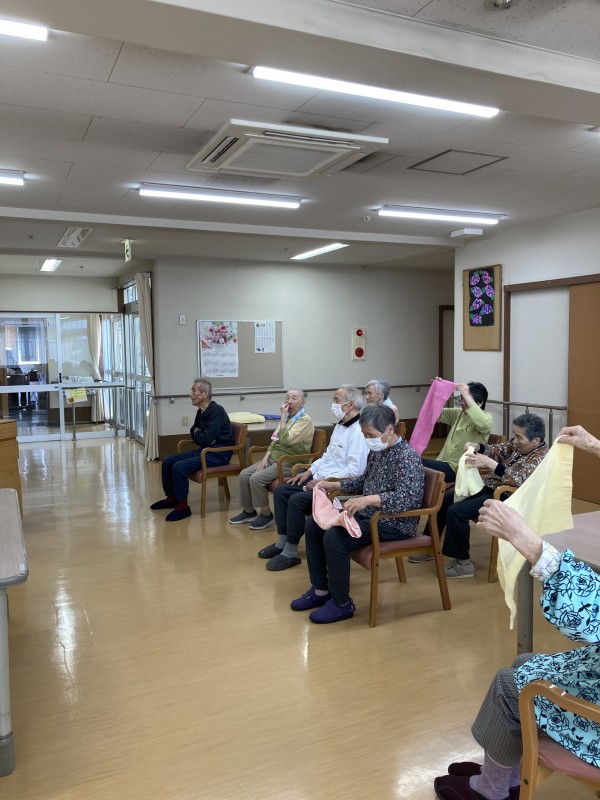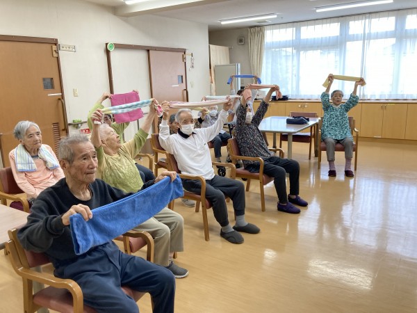 本日はリモート体操の日です。タオルを使って体を動かしますよ~!毎日DVDをみながら体操をされている皆さまですが、先生とつながっていると先生の声掛けに元気に反応されたり、いつも以上に自然と体が動いているご様子です。