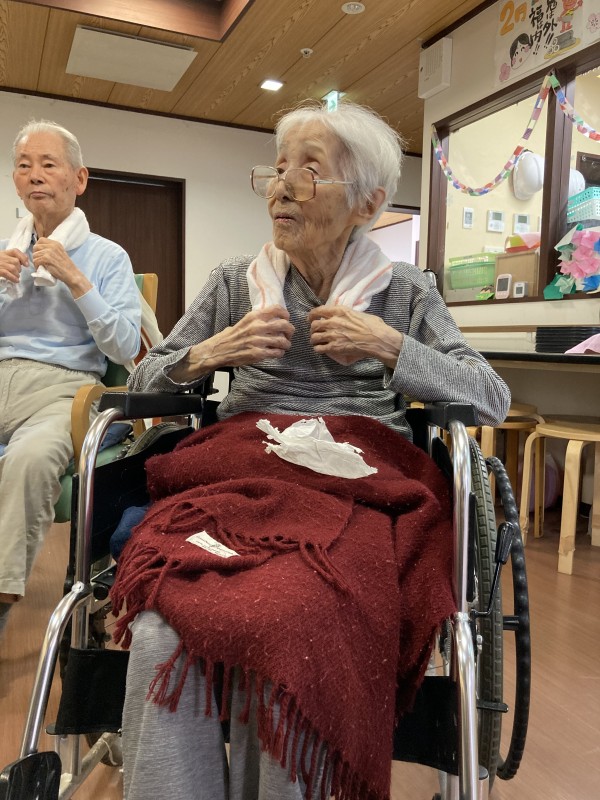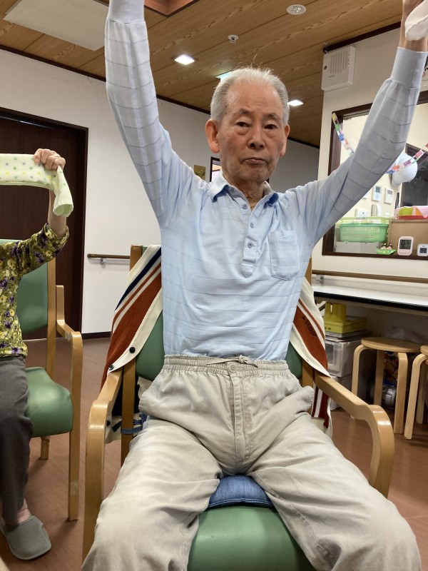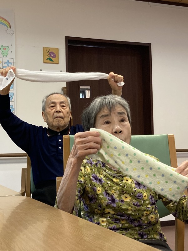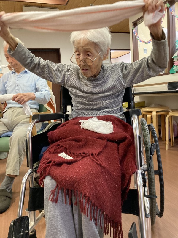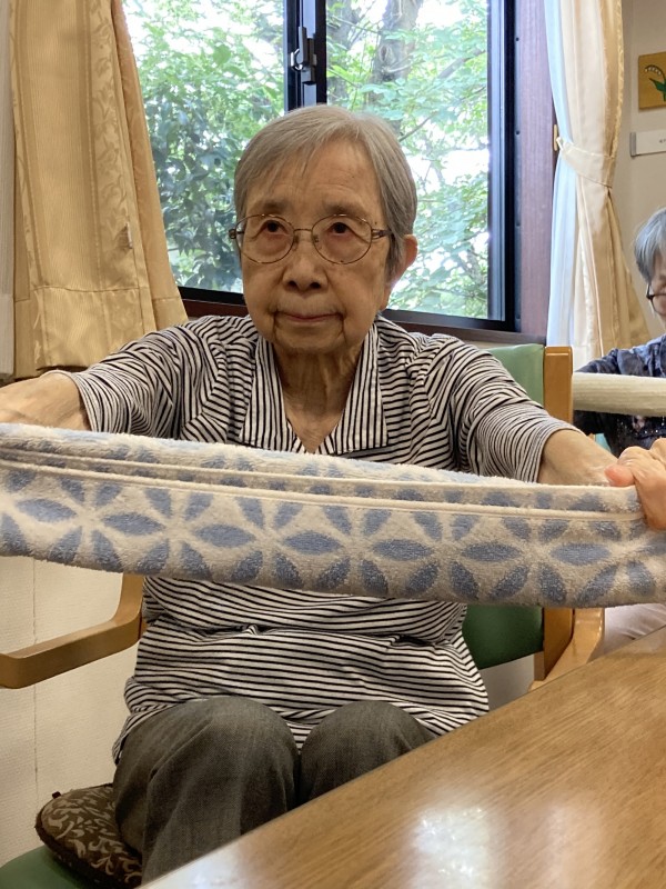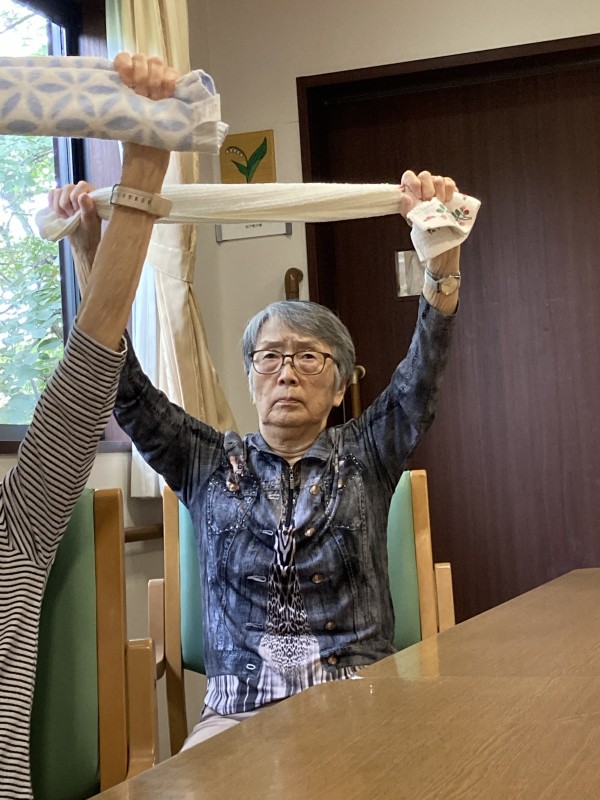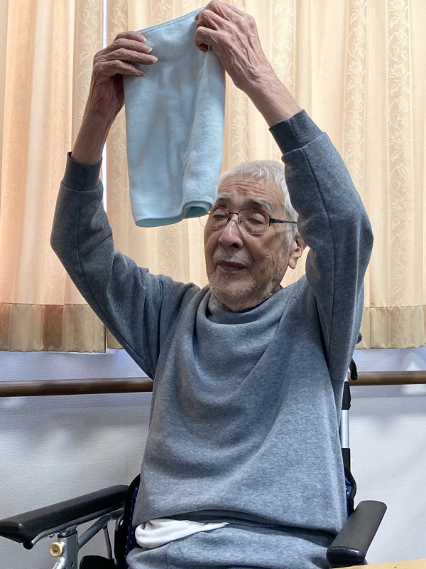 タオルを使った体操を行っている様子ですが、入居者様は器用にタオルを使って上手に体操をされていました