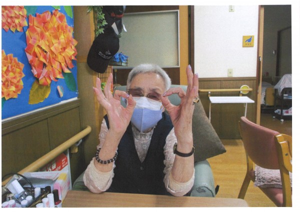 本日は【ネイルケア】の日。手の爪を整えお好きな色を爪にのせていきます。爪にネイルするだけで気分も上がりますね。男性は透明の爪の保護にもなるものをつけました。爪がピカピカになると男性も笑顔になりますね。初めて体験される方も多いので新鮮な感覚だといわれる方も。ピンクやブルーを付けた方もいらっしゃいます。色々な事を体験して、その感覚を味わうのも良い経験になりますね。女性陣もネイルを見せ合ってお話が盛り上がっていらっしゃいました♪