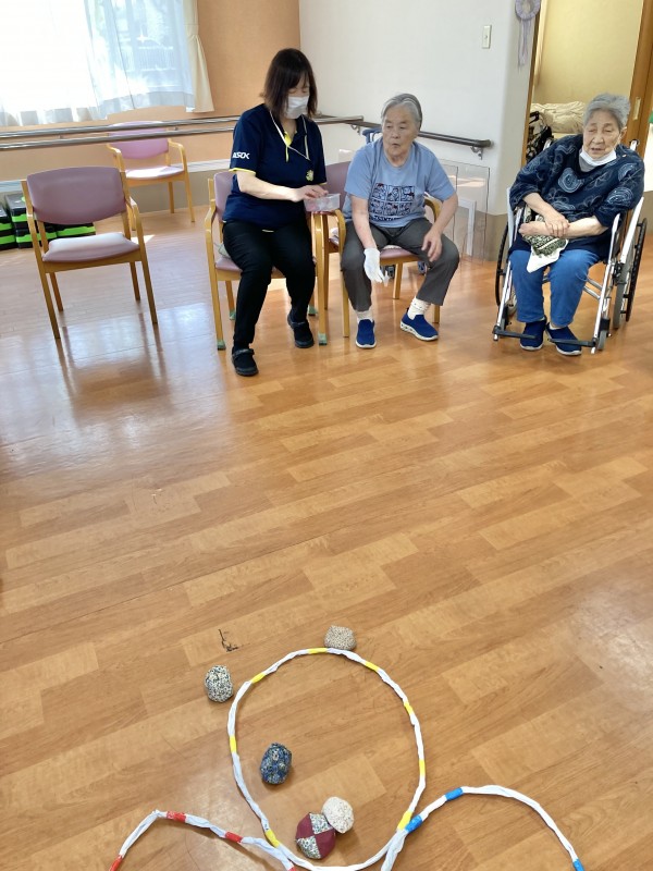 3色の輪の中に、お手玉を投げて入った数で順位決めました。