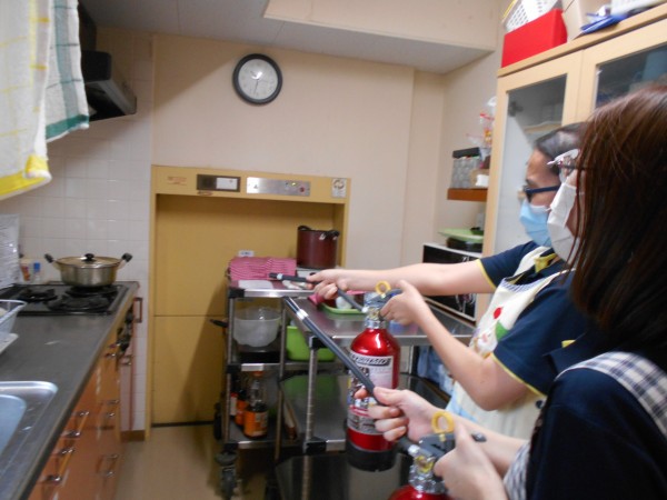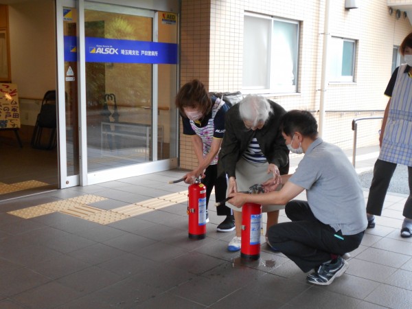 外では希望されたご利用者様がスタッフと一緒に訓練用の消火器を使い消火訓練を行いました!
