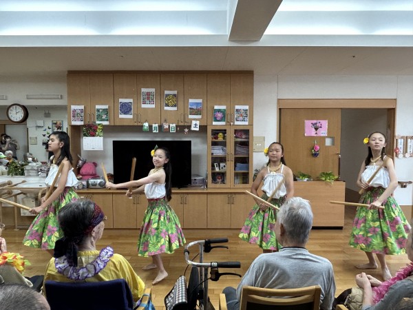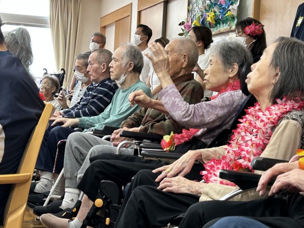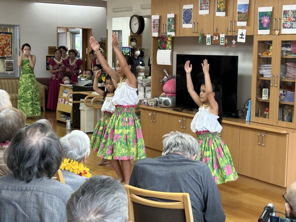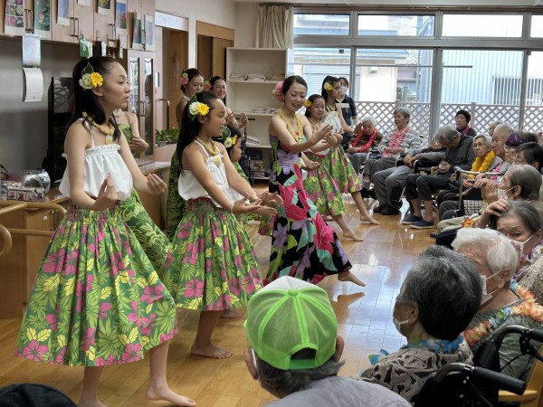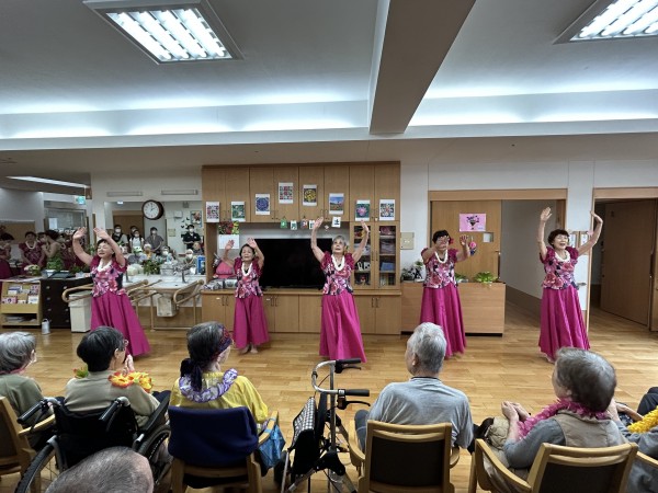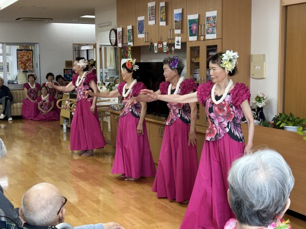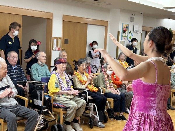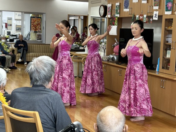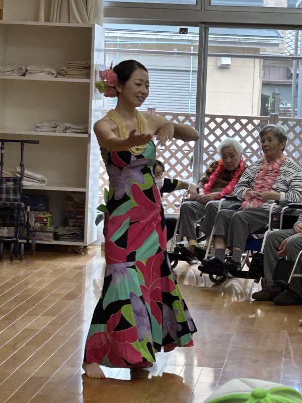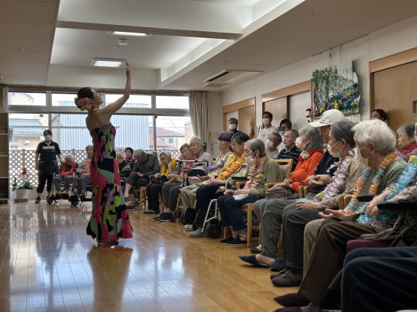 曲に合わせて手拍子をする方、手を動かして一緒に踊る方、涙ぐまれる方、可愛いフラガールに目を細め笑顔になられる方。はたまた素敵なフラガールに釘付けになる男性利用者様(笑)とても楽しい時間となりました。