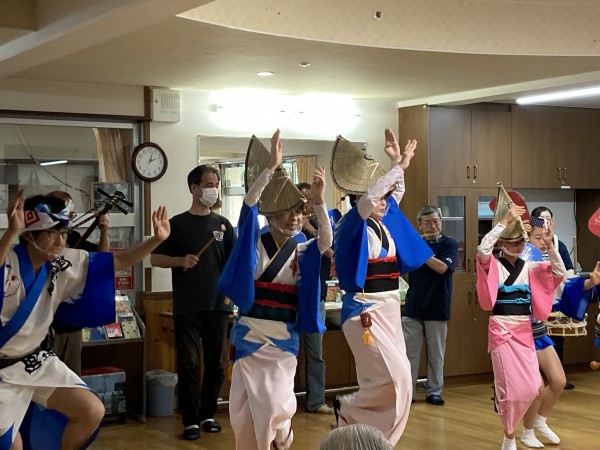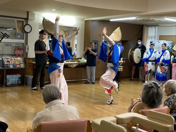 組踊りが終わると、楽器の紹介・ご利用者様の近くまで踊りに来て下さるのですが…