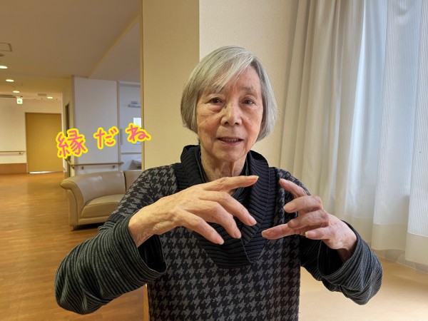 「こんなにしてくれてねぇ」と、ご家族様からのプレゼントに喜ぶマダム。