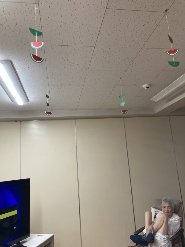 今日は色紙で制作が始まりましたよ~。スイカに天の川…色紙で作ったといえ見ていて涼しくなってきます(^^)スイカが天井からゆらゆらと揺れているのを見てニコニコとされているご入居者様もいらっしゃいました。8月に夏祭りのレクリエーションを予定しているので本物のスイカが食べたいですね~(^O^)
