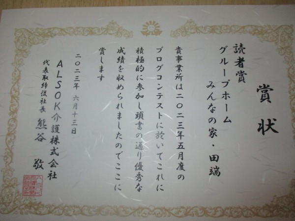 祝 ❣ “読者賞” みんな家田端2階の介護ブログ
