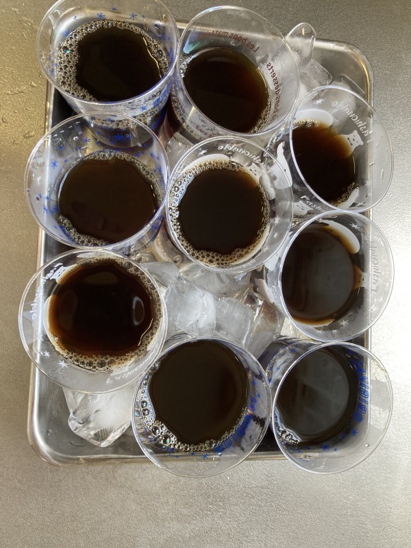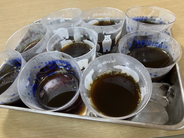 バットに氷をはったものにコーヒー入りのカップを入れ、余熱がとれたら冷蔵庫に入れます。