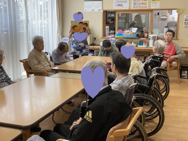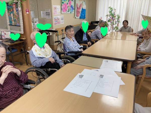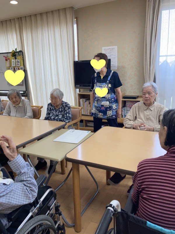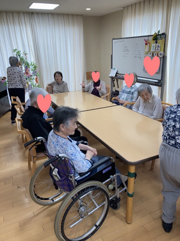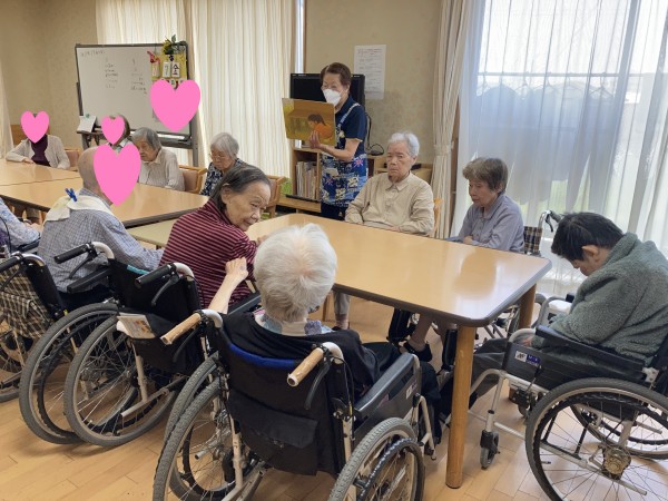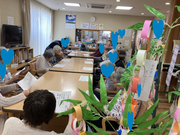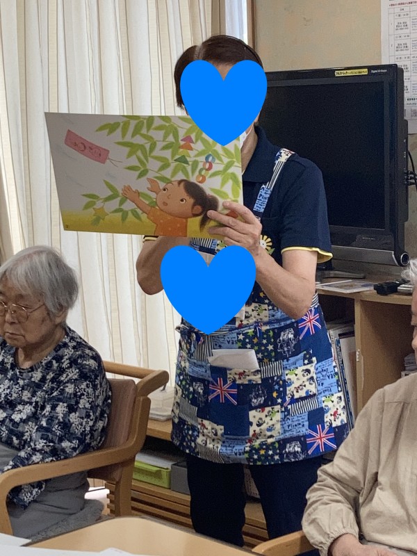 先ずは、11時頃、1階の方2階の方全員1階の方に集まって頂き、職員による紙芝居の読み聞かせと全員で七夕の曲を歌いました( *´艸`)