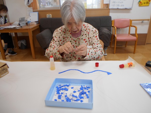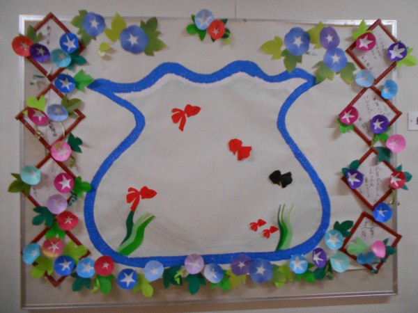 あの水色の折り紙は「金魚鉢」でした~。真ん中にどっしりと金魚鉢!!なんとも涼しそうな感じに仕上がりました~。
