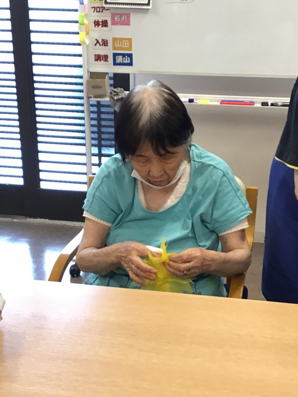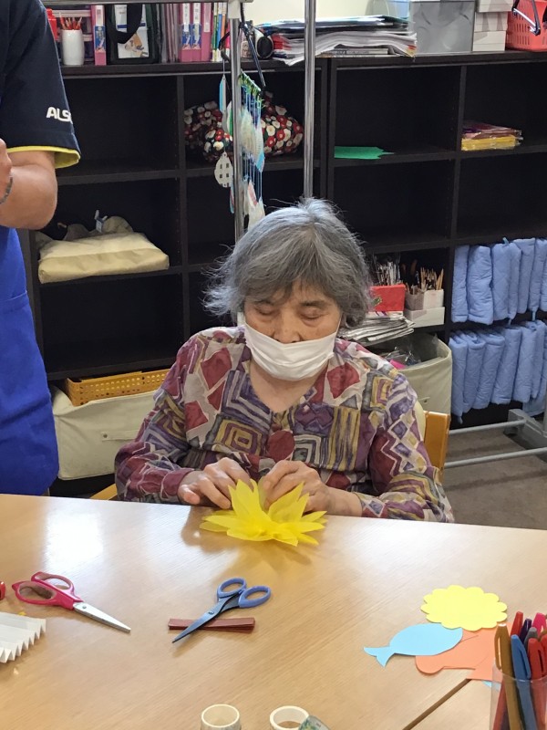 さて富士見台では壁面に皆様が制作してくださった【あじさい】の花を