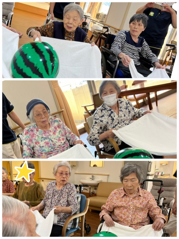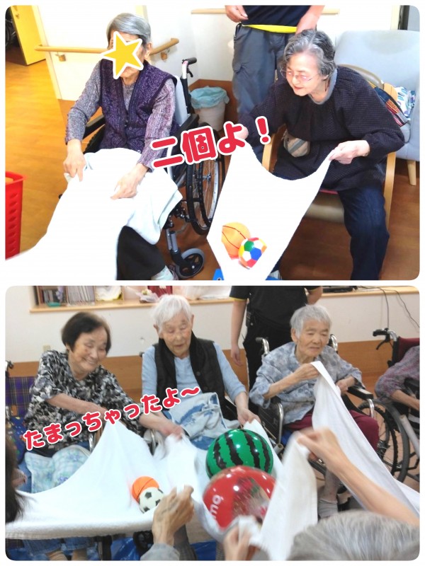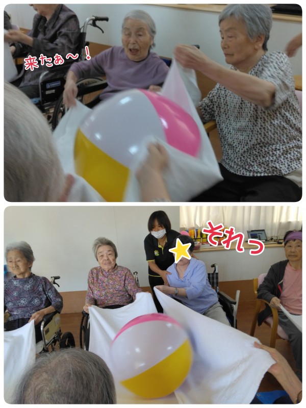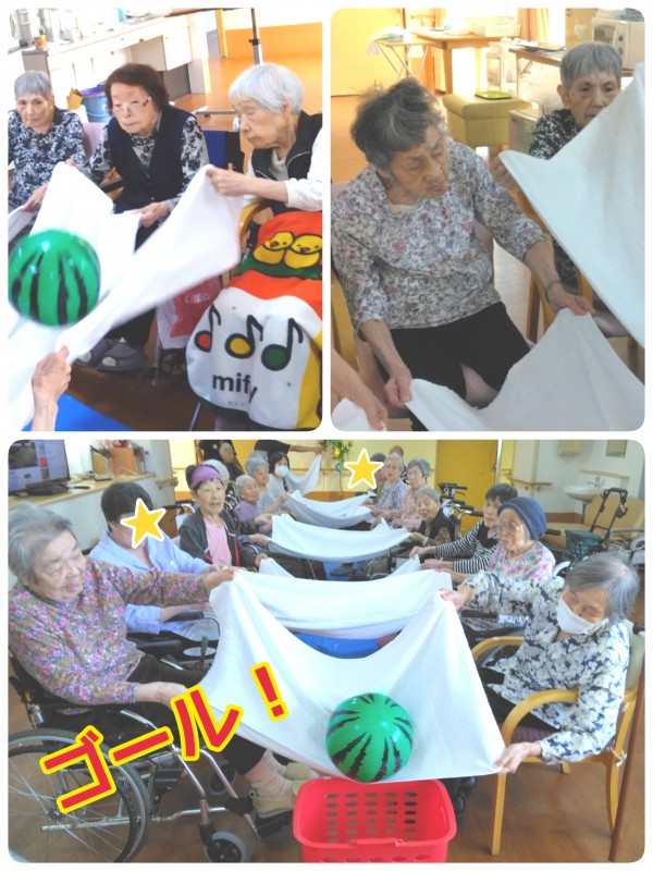 天の川に落とさないように、バスタオルでボールをゴールに運びます!