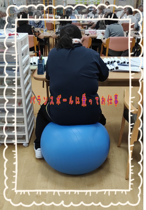機能訓練で使用しているバランスボールに乗っかって書いていました(/・ω・)/