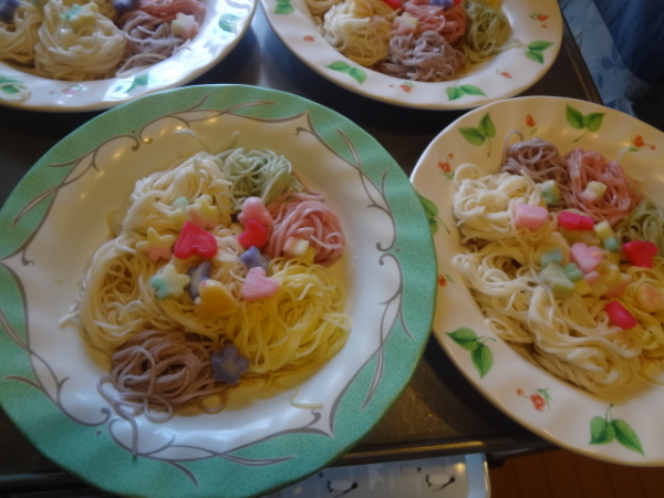 5色のそうめんにカラフルなお星さまやハートをトッピング(^o^)丿