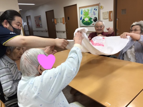 バスタオルを使って風船落とさないようにを隣の人に渡したり、風船バレーをしたりと大盛況