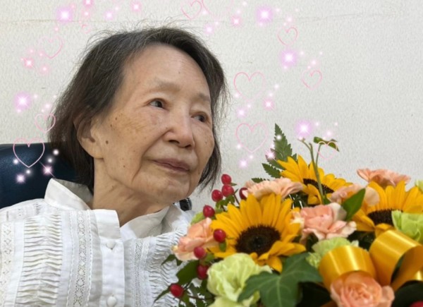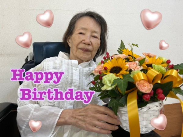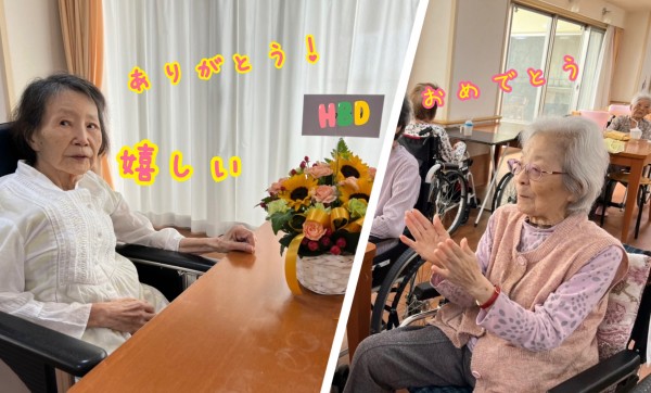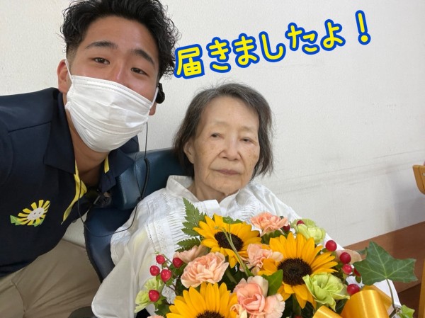 ご家族様からの素敵なお花と、ご入居者様からの「おめでとう」に