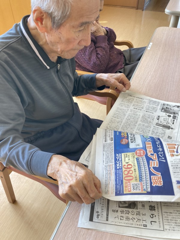 毎朝、熱心に集中して読まれています。テレビ欄、政治面、社会面…時々メモをとられるご入居者様もいらっしゃいます。すごいです!!