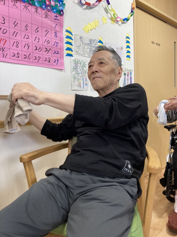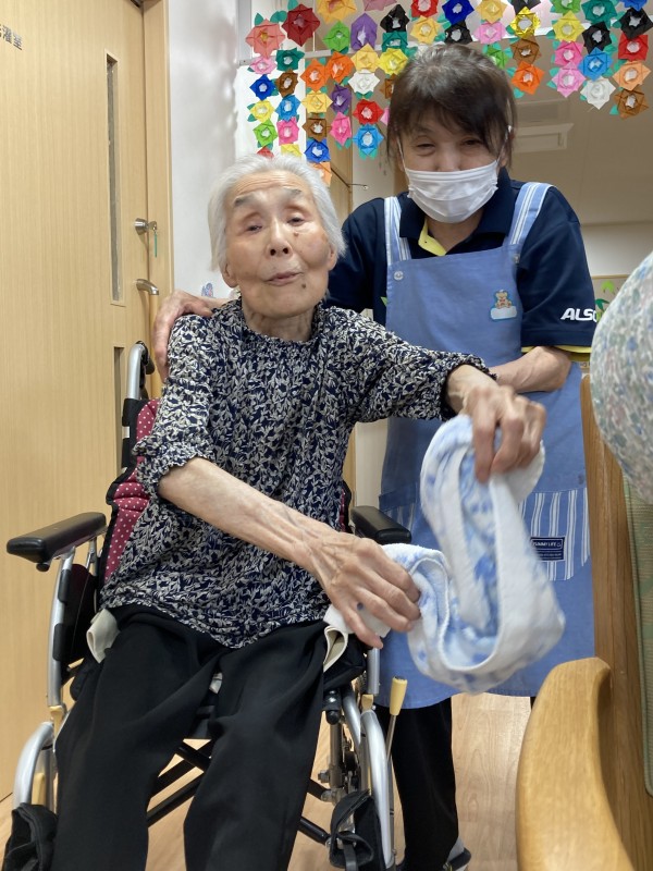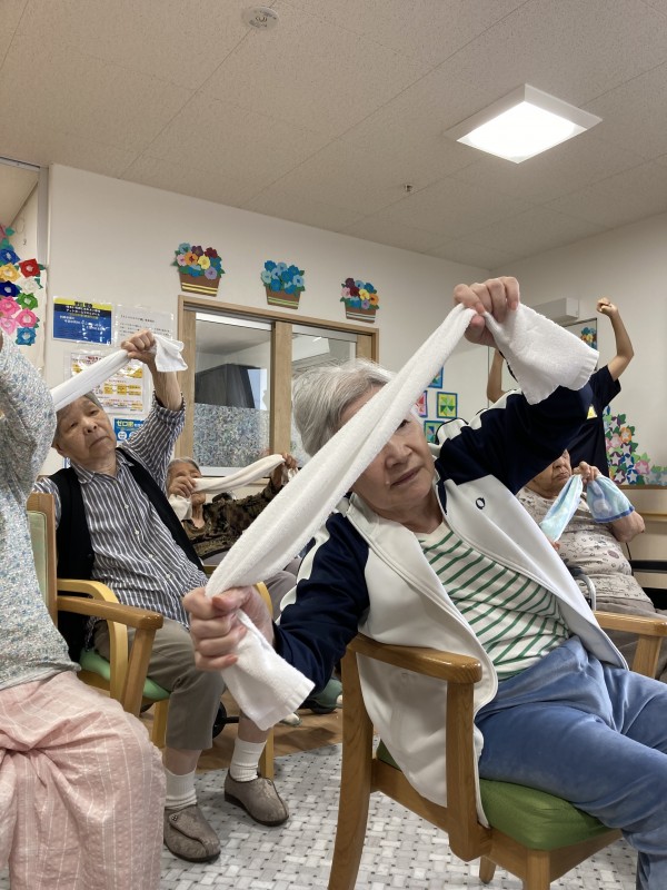 まずは日付の確認を指で表します。次にしっかりとタオルを握り腕を伸ばして「うえ〜した〜ななめ〜」と身体を動かしていきます。