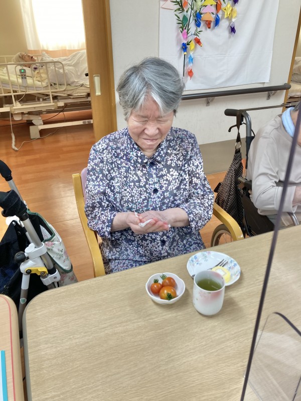 今日のおやつに収穫したミニトマトを、トマトがとても好きな方へ出されていました。
