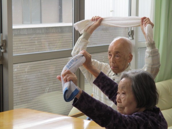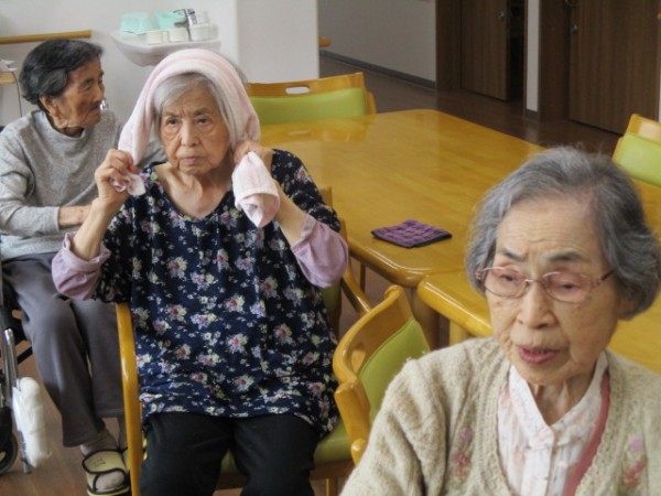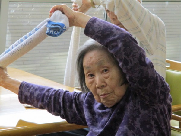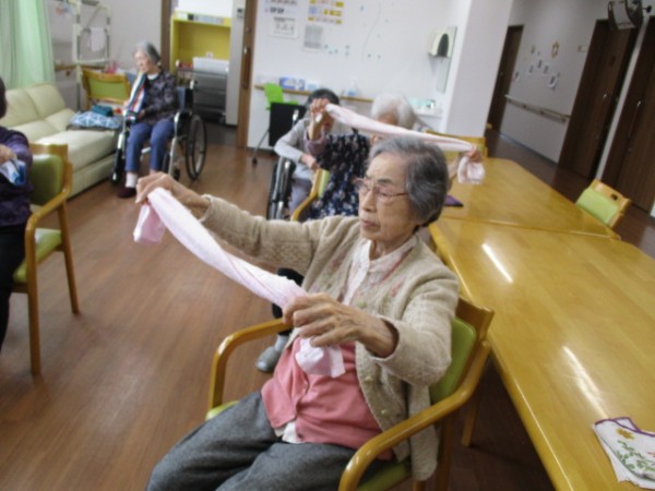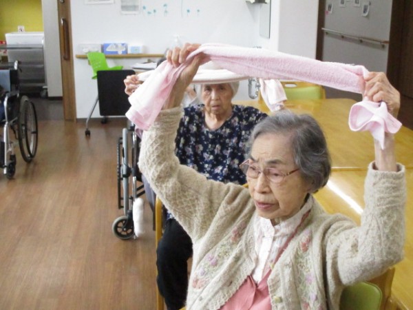 リモートALSOK体操(タオル体操)参加されているご様子です( ^ω^)・・・ タオルを使用して手がしっかりと上まで上がられていますね(*^。^*)