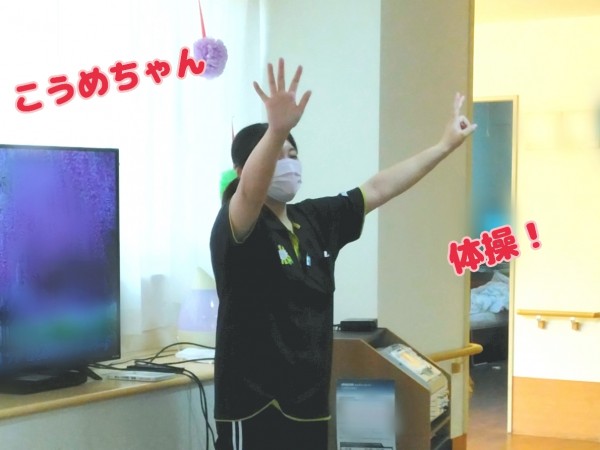 やわらかく入居者様を包みこみながら、しっかりリードするこうめちゃん体操。