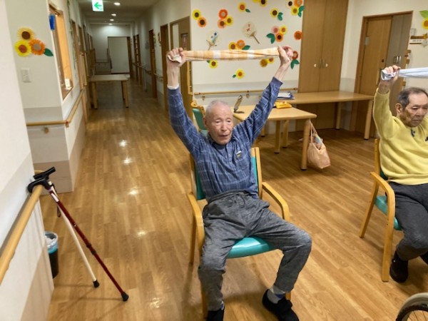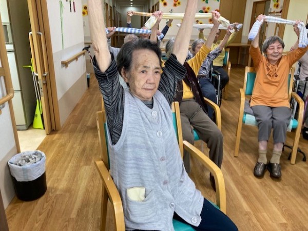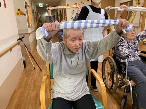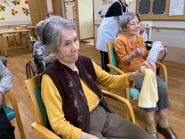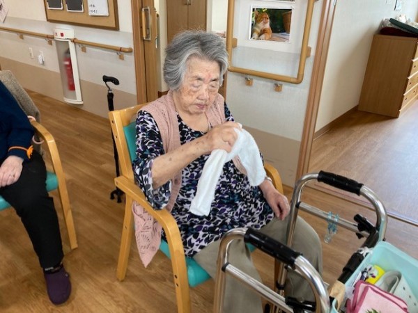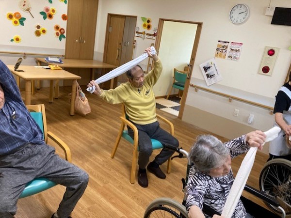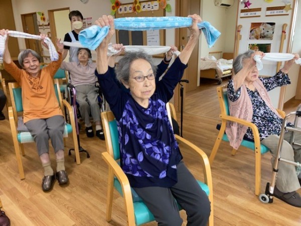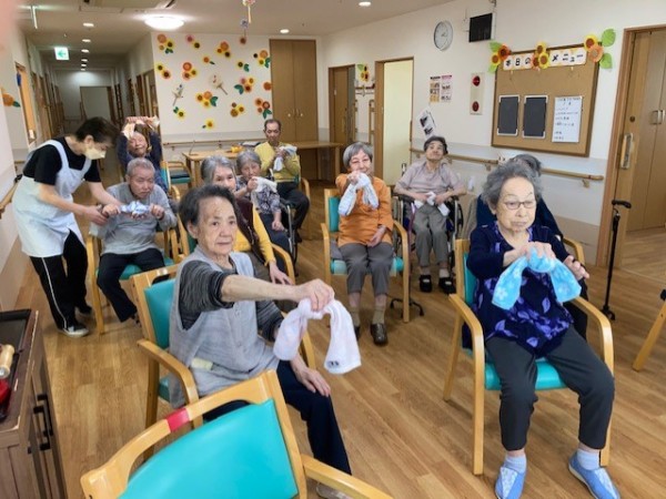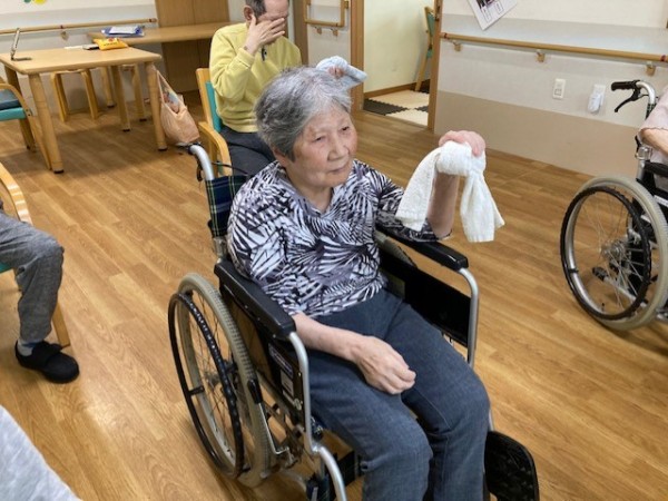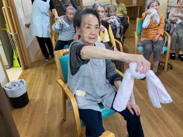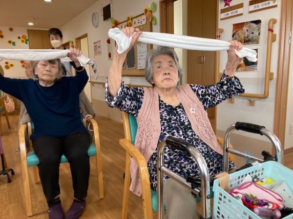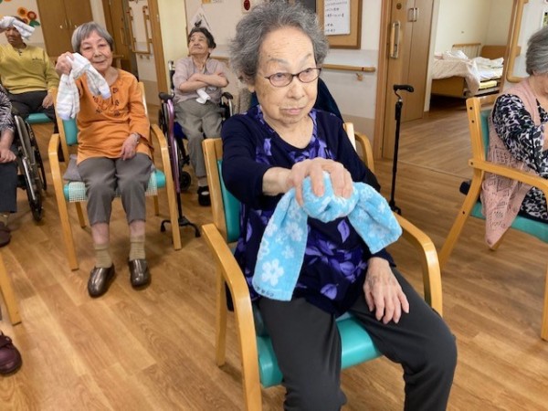 こんにちは!グループホームみんなの家・川崎新百合ヶ丘の介護ブログです。今日は先日開催されました、健康増進体操のタオル体操(リモート)の様子をご覧ください、AK(あんぜん・かんたん)トレーニングの第一弾としてタオル体操があり、タオルを握る・たたむ・結ぶ・ほどくなど、指を動かすことで脳に働きかけながら全身を動かし、体力維持向上を目指します。